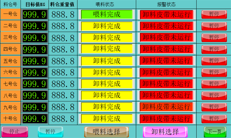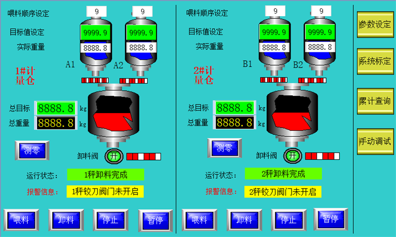 設(shè)置多個(gè)獨(dú)立儲(chǔ)料倉和多個(gè)獨(dú)立計(jì)量倉,對(duì)每種需要計(jì)量的物料預(yù)先按照各自配方進(jìn)行喂料控制(分為高速喂料和低速喂料、提前量控制)進(jìn)入計(jì)量倉內(nèi),等待生產(chǎn)需要時(shí)可以直接同步進(jìn)行卸料。